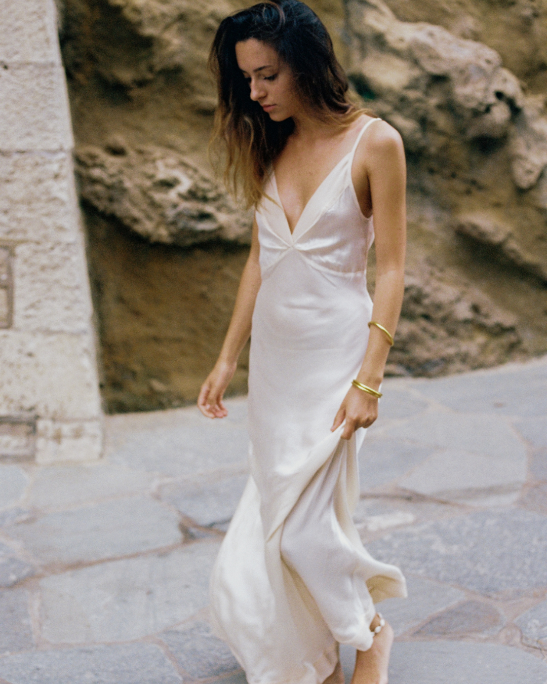 This 100% luxurious silk sun dress drapes beautifully, enhancing your natural grace and movement. Float around like you're still on your Summer Vacation and wear her from day to night.