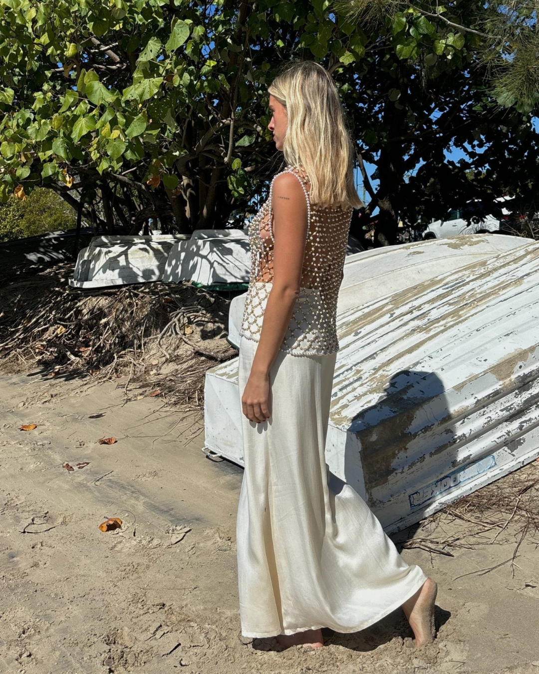 The Cheval Blanc Skirt is a long bias cut skirt which can be worn low on the hip or pulled up to sit a little higher. The single layer 100% silk skirt is the perfect staple through summer and winter. Look chic wearing it with your Vacanza 'Sol Matutino' Baby Tee or dress her up with the Chateuax Lila' Bralette and a leather bomber.