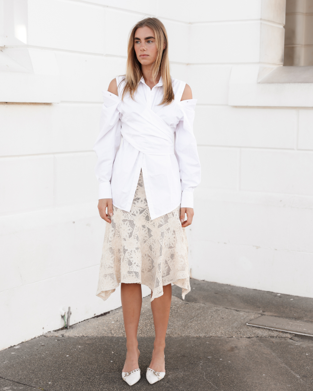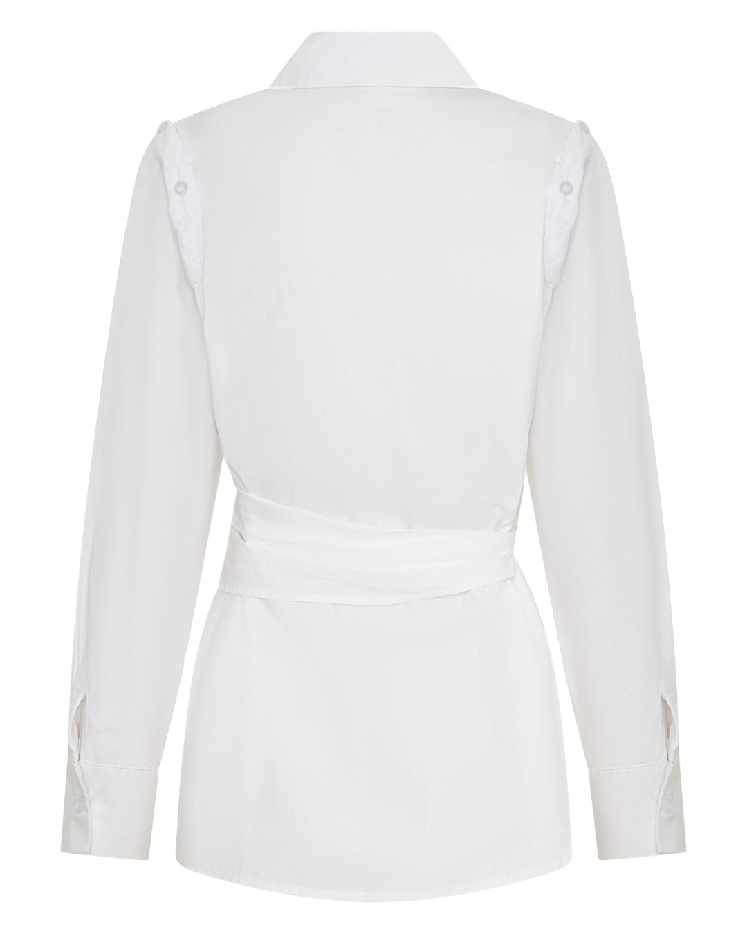 This elevated update features detachable shoulders, secured with three subtle buttons, giving you the freedom to switch between a structured wrap shirt and a softened, deconstructed version that catches the light (and compliments) with every move.