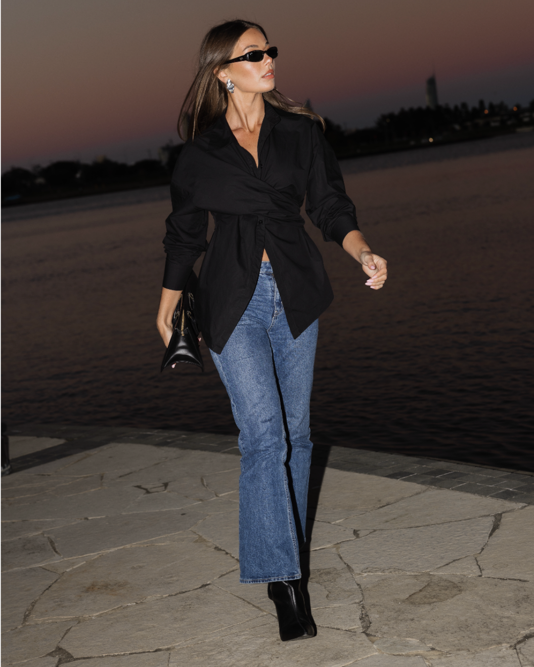 Meet your new winter wardrobe essential -the Business Wrap Shirt in Noir by Modalità Vacanza. Made with a thicker cotton than our previous Wrap Shirts to help you survive these winter days, this versatile piece is the epitome of effortless elegance, designed to transition seamlessly from the Desk to Dusk. Crafted with meticulous attention to detail, it features long, chic cuffs that add a touch of sophistication to your look.