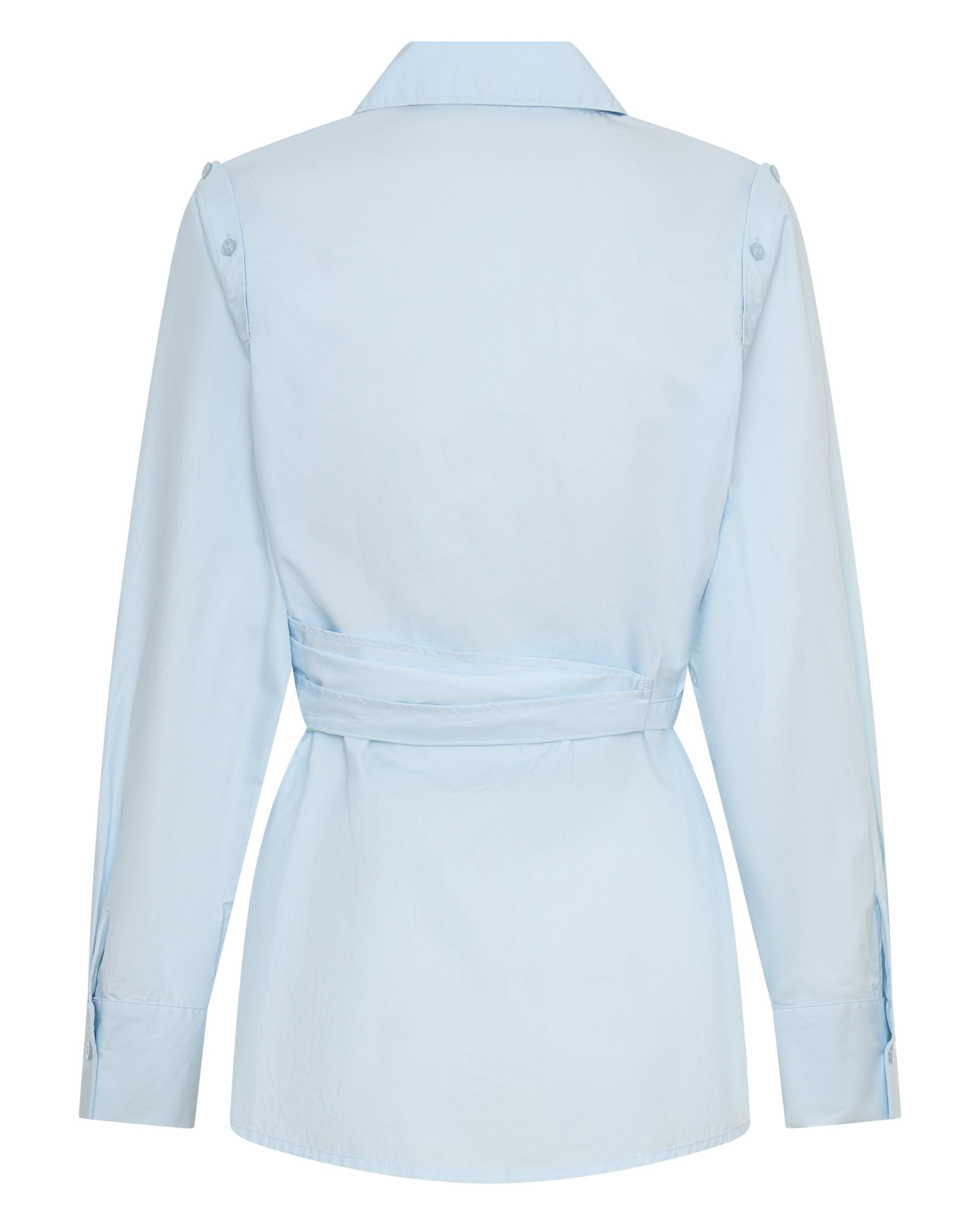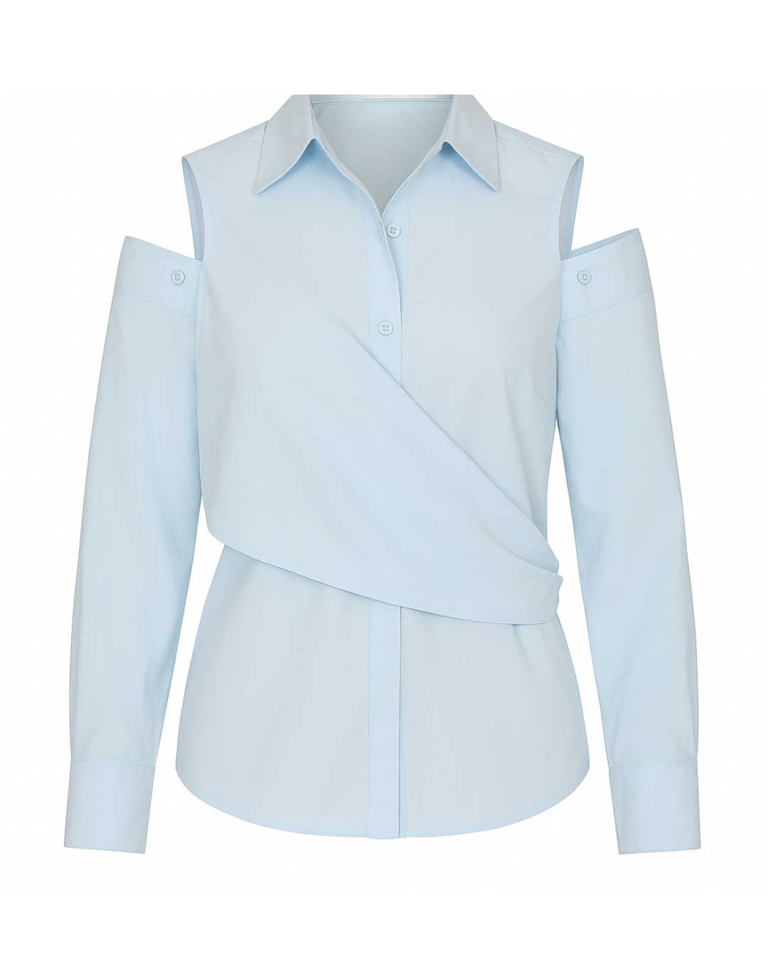 This elevated update features detachable shoulders, secured with three subtle buttons, giving you the freedom to switch between a structured wrap shirt and a softened, deconstructed version that catches the light (and compliments) with every move.