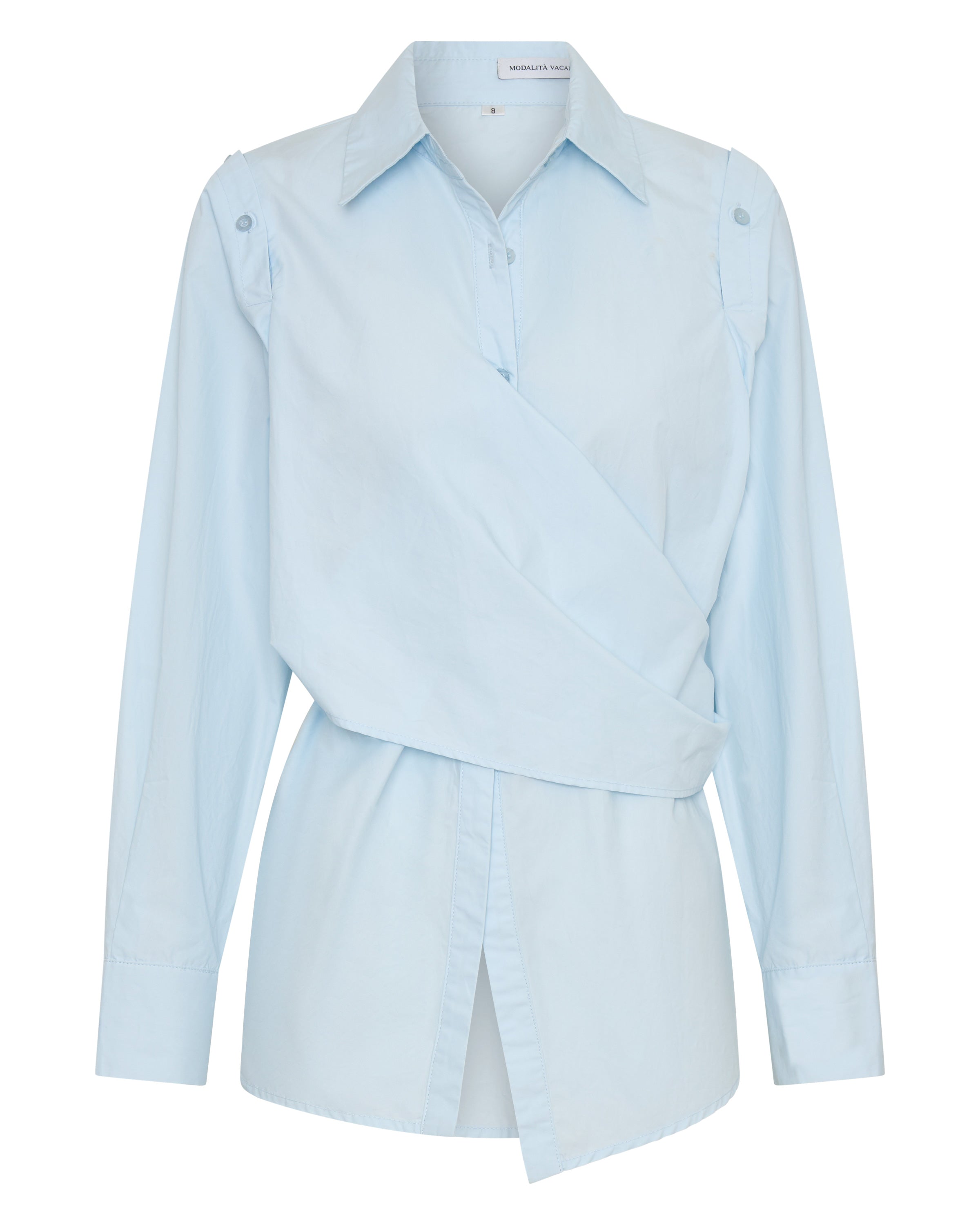 SMeet the Deconstructed Wrap Shirt by Modalità Vacanza - an architectural twist on our cult-favourite wrap silhouette, reimagined for the heat of summer. Clean lines, crisp cotton, and a flirtatious shoulder moment designed to feel equal parts polished and undone.