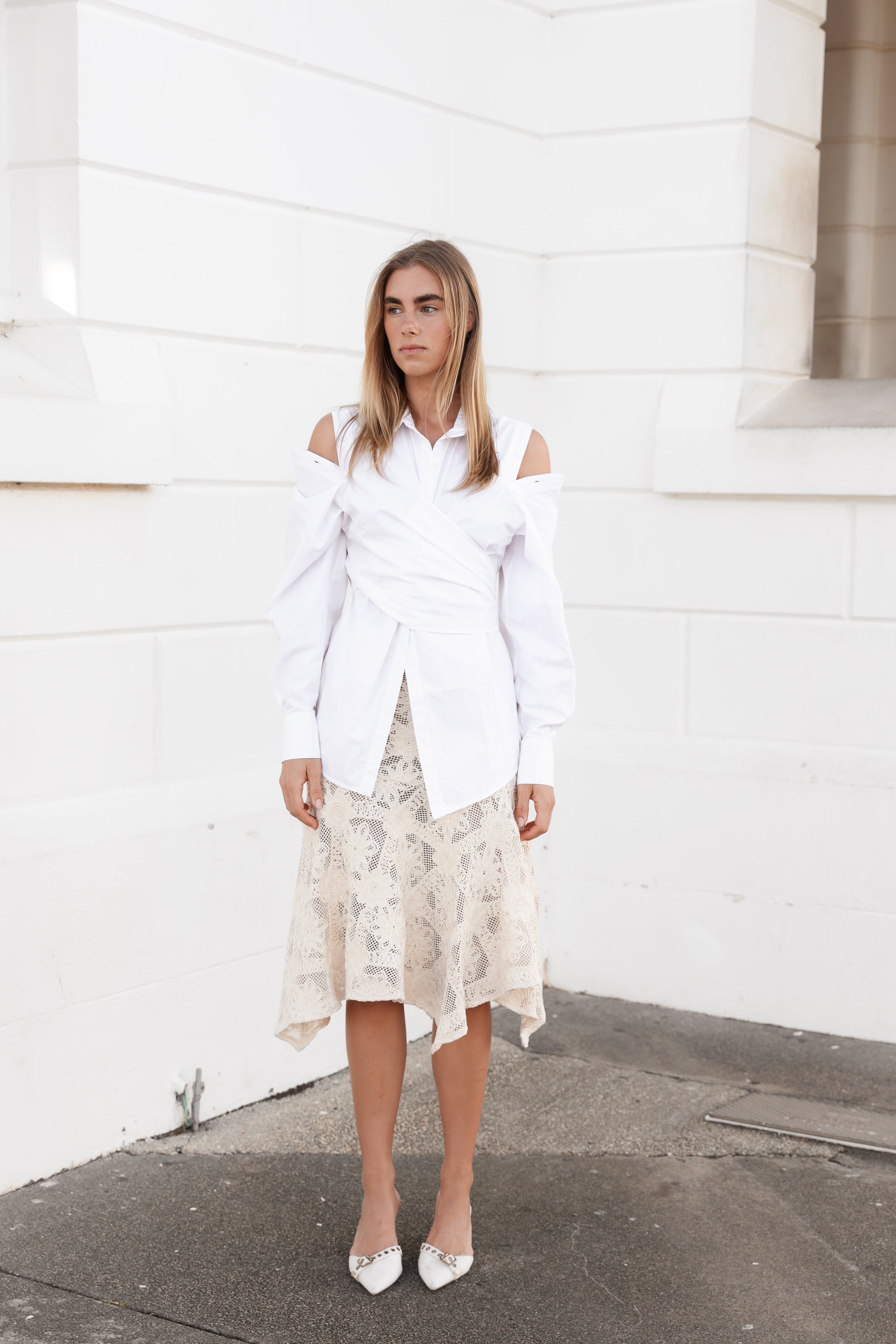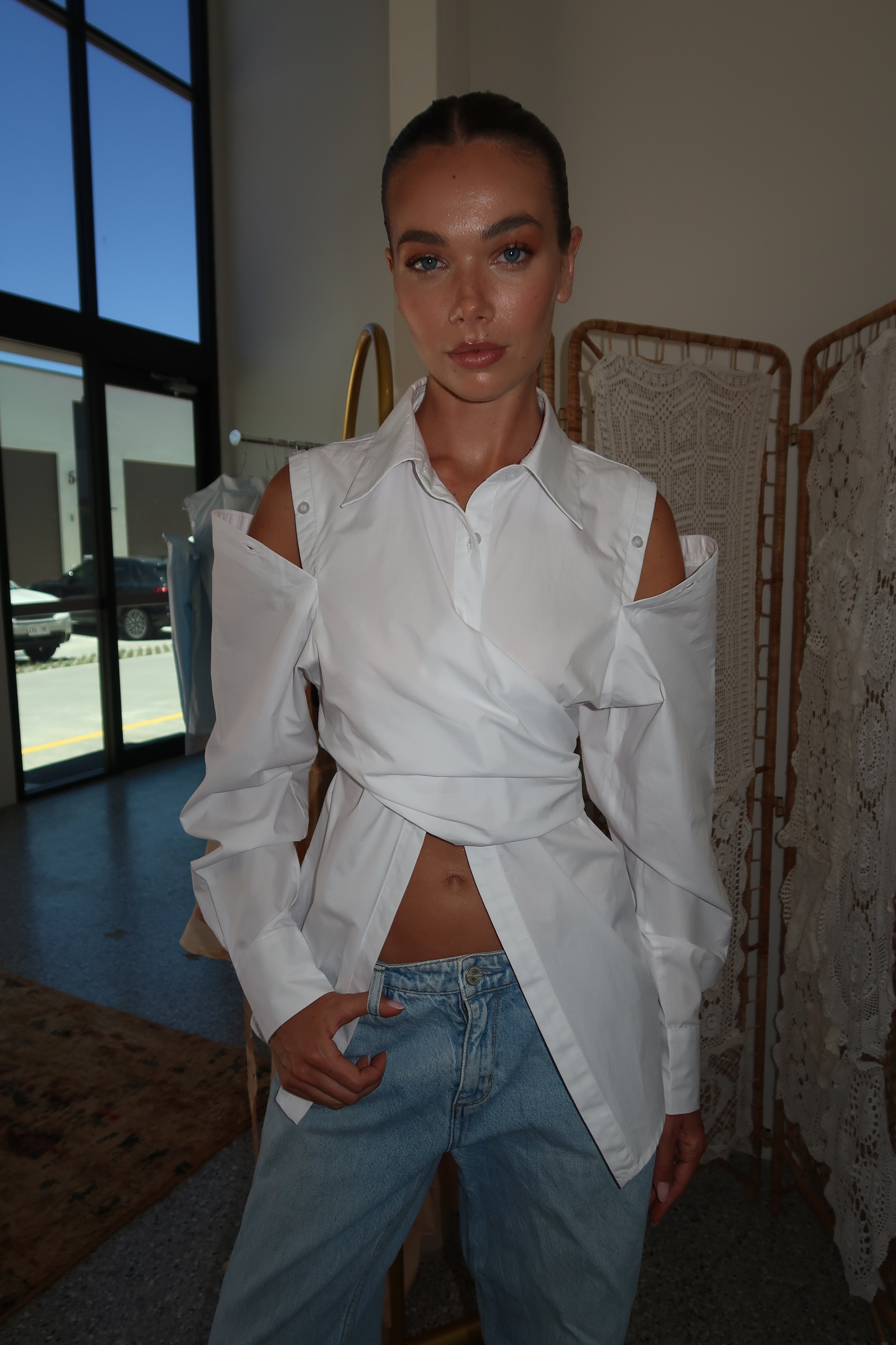 This elevated update features detachable shoulders, secured with three subtle buttons, giving you the freedom to switch between a structured wrap shirt and a softened, deconstructed version that catches the light (and compliments) with every move.